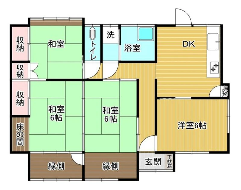 | 設備 | 収納スペース、トイレ、バス・トイレ別、バス、洗面台、浴室に窓、プロパンガス、汲取、屋外駐車場、2口コンロ、キッチンに窓、勝手口、シューズボックス、収納4ヶ所以上、洗面所にドア、洗面所に窓、床の間、続き和室 | ||