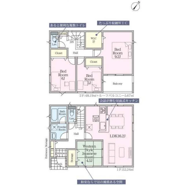 | 設備 | プロパンガス、電気、上水道、浄化槽、システムキッチン、カウンターキッチン、浄水器、給湯、トイレ2箇所、温水洗浄便座、シャンプードレッサー、浴室乾燥機、フローリング、複層ガラス、ルーフバルコニー、収納スペース、ウォークインクローゼット、床下収納、駐車2台可、ディンプルキー、モニタ付インターホン、火災警報器等設置済、建設住宅性能評価取得(予定含む) | ||