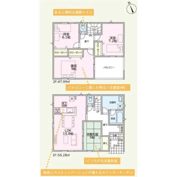 | 設備 | プロパンガス、電気、上水道、下水道、システムキッチン、カウンターキッチン、浄水器、給湯、トイレ2箇所、温水洗浄便座、シャンプードレッサー、浴室乾燥機、フローリング、複層ガラス、ルーフバルコニー、収納スペース、床下収納、ディンプルキー、モニタ付インターホン、火災警報器等設置済、建設住宅性能評価取得(予定含む) | ||