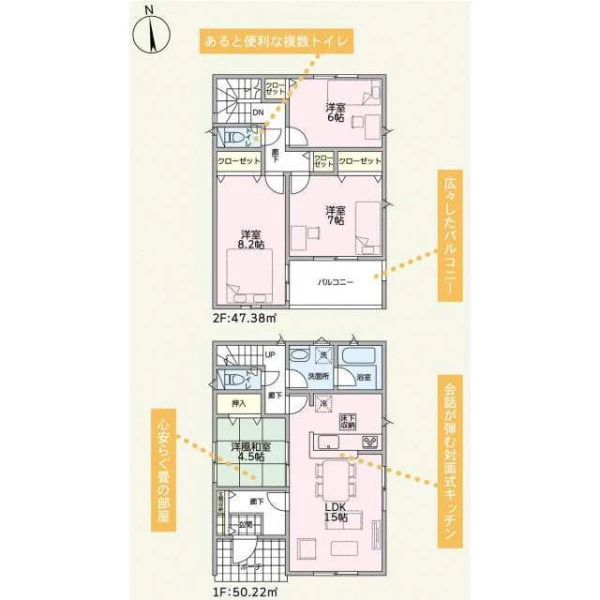 | 設備 | プロパンガス、電気、上水道、浄化槽、システムキッチン、カウンターキッチン、浄水器、給湯、トイレ2箇所、温水洗浄便座、シャンプードレッサー、浴室乾燥機、フローリング、複層ガラス、ルーフバルコニー、収納スペース、床下収納、ディンプルキー、モニタ付インターホン、火災警報器等設置済、建設住宅性能評価取得(予定含む) | ||