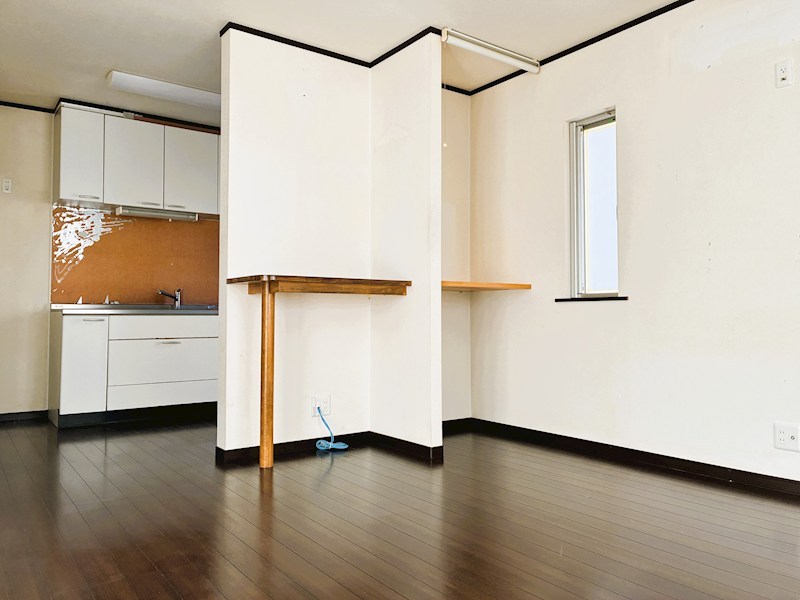 リビングには机や物置きなど多用途で利用可能な棚付き。