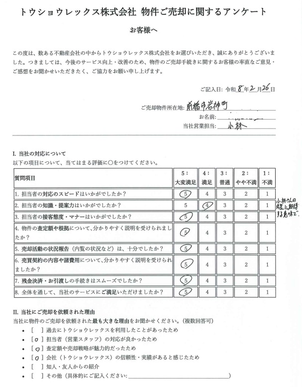 当初の担当者の方と代わってしまい、一抹の不安もありましたが、誠実に一生懸命に対応して頂いたこと、担当変更の最初の挨拶時に「この物件を売却できるまで私は辞めません!」との言葉に人柄を感じ安心してお任せできました。トウショウレックスさんの実績もさることながら良い人財をもっていると思いました。またご縁があることを祈っています。今回はありがとうございました。